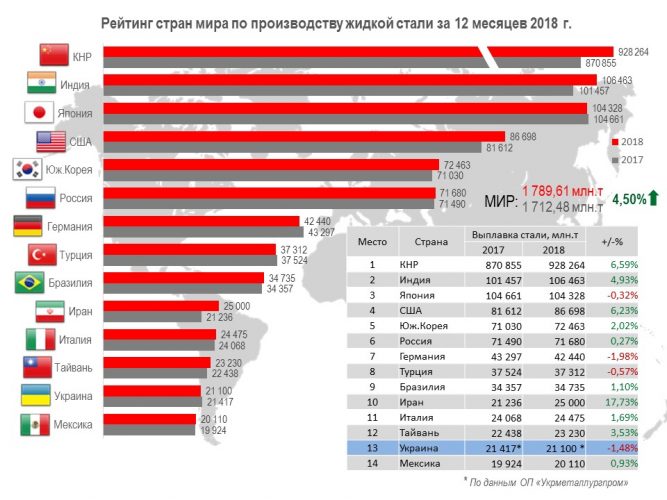 Среди 64 стран-производителей стали, Украина находится на 13-м месте (21,10 млн.т, 98,52% относительно 2017 г.).
