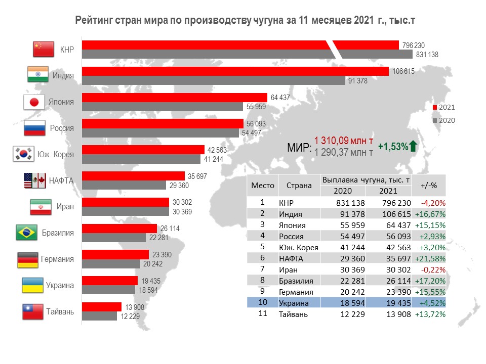 Украина (19,44 млн т или 104,5% относительно января-октября 2020 г.) занимает 10-ю позицию среди 38 стран-производителей чугуна.