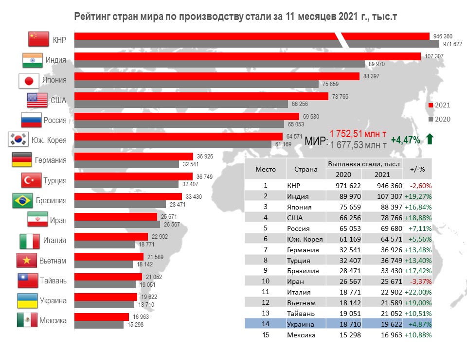 Украина (19,62 млн т или 104,9% относительно января-ноября 2020 г.) занимает 14-ю позицию среди 64 стран-производителей стали.