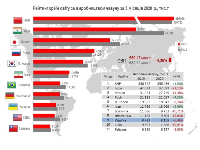 За даними Worldsteel, за 5 місяців 2020 р. металургійними підприємствами країн світу вироблено 559,17 млн т чавуну, з яких 527,07 млн т доменним способом і 32,10 млн т методом прямого відновлення. Це на 4,36% нижче за показник аналогічного періоду 2019 р. (584,64 млн т).