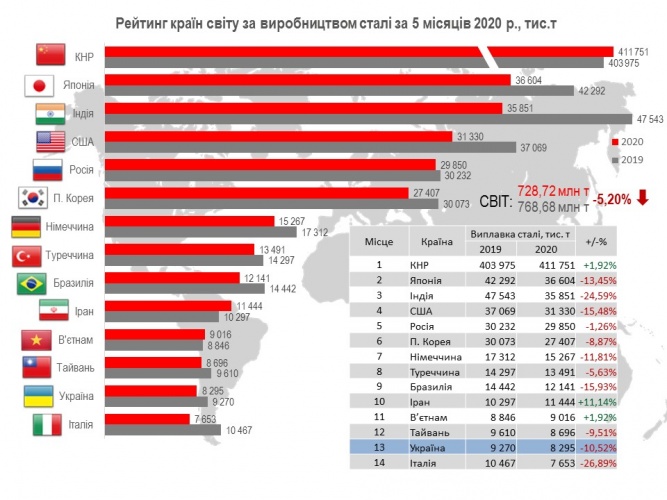 Україна (8,30 млн т або 89,5% відносно січня-травня 2019 р.) обіймає 13-те місце серед 62 країн-виробників сталі.