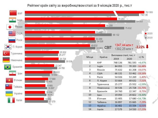 Україна (15,33 млн т або 93,5% відносно січня-вересня 2019 р.) обіймає 13-те місце серед 62 країн-виробників сталі.