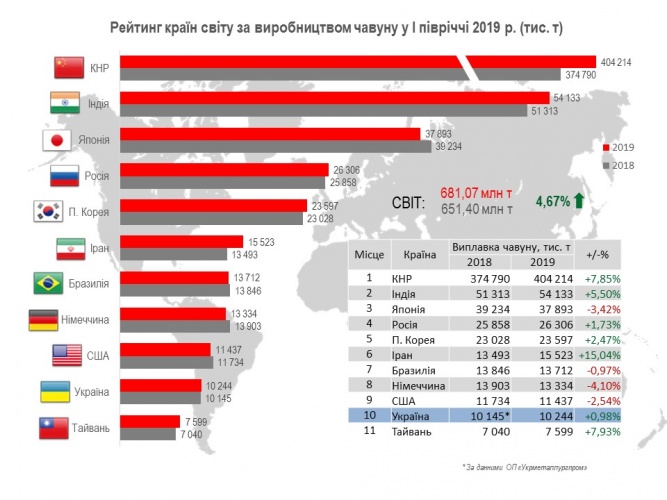 Україна знаходиться на 10-му місці серед 40 країн-виробників чавуну (10,24 млн т або 100,98% відносно 6 місяців 2018 р.).