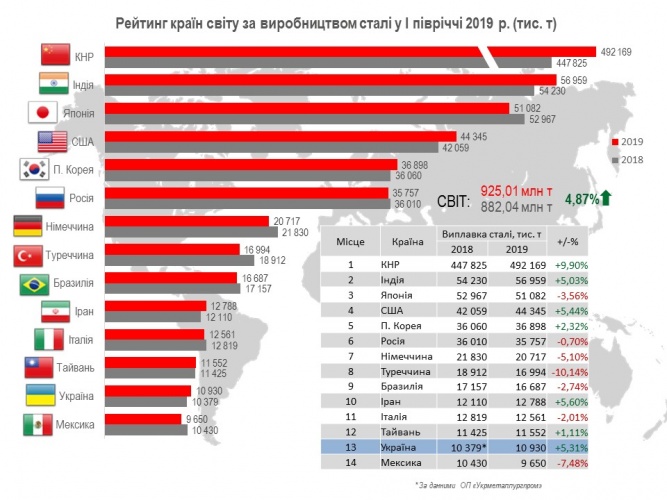 Серед 62 країн-виробників сталі, Україна, як і раніше, обіймає 13-у позицію (10,93 млн т, або 105,3% відносно січня-червня 2018 р.).