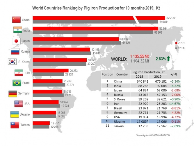 Ukraine occupies the 10th position among 40 world pig iron producers (17.07 Mt or 99.9% to 10 months 2018).