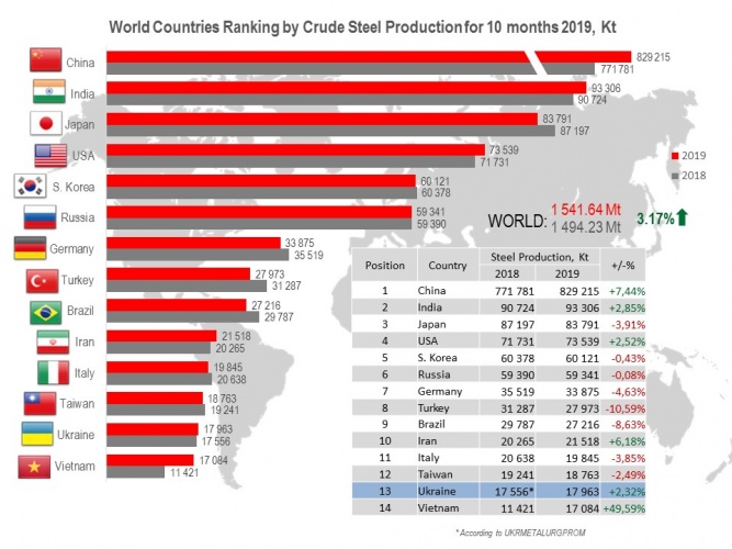 Among 62 world steelmaking countries, Ukraine occupies the 13th position (17.96 Mt or 102.32% to Jan-Oct 2018).