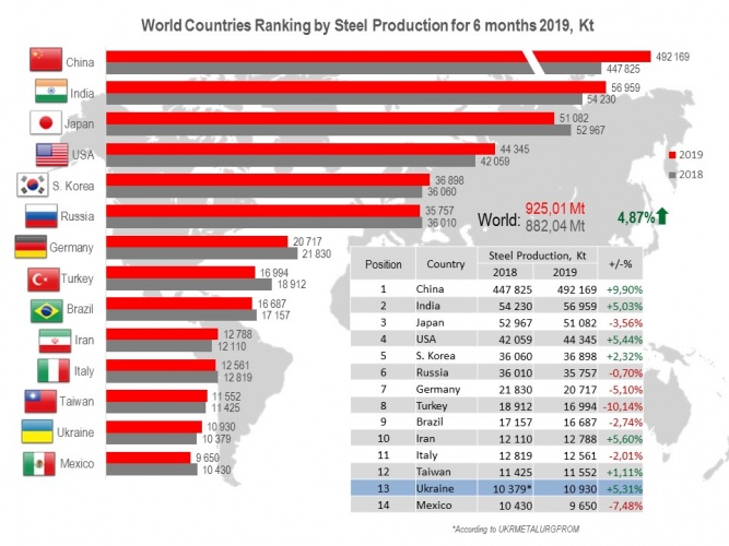 The steel world production for 6 months 2019 is 925.01 Mt that is on 4.87% more than for same period of 2018 (882.04 Mt).