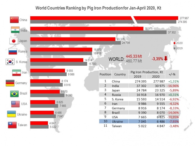 Ukraine occupies the 10th position among 40 pig iron producers (6.49 Mt or 92.1% to Jan-Apr 2019).