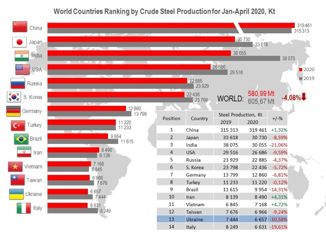 The steel world production in Jan-Apr 2020 is 580.99 Mt that is of 4.08% lower than for Jan-Apr 2019 (605.67 Mt).
