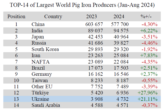 Ukraine (4.73 Mt or 121.11% to Jan-Aug 2023) remains on 13th position among 40 world pig iron producers.