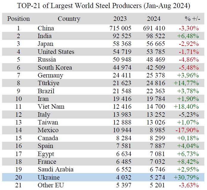 Ukraine in the World Ferrous Production in Jan-Aug 2024