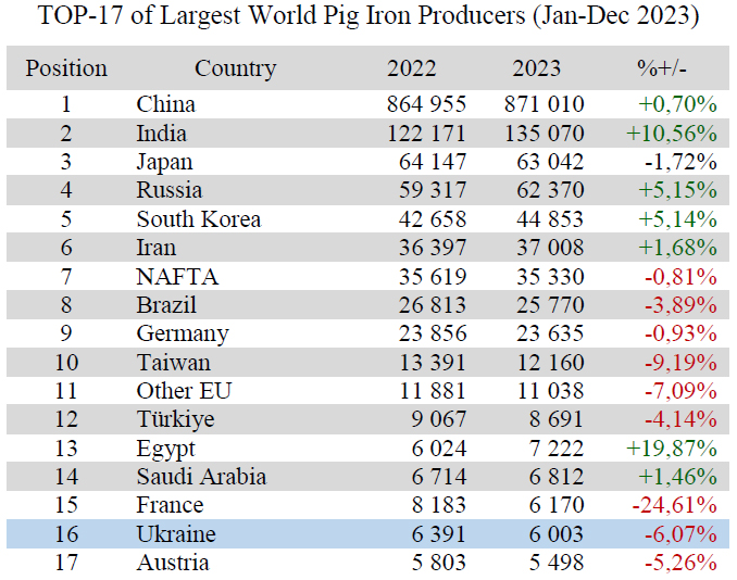 Ukraine (6.00 Mt or 93.93% to Jan-Dec 2022) remains on 16th position among 40 world pig iron producers.