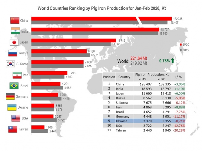 Ukraine raised to the 9th position among 40 world pig iron producers (3.36 Mt or 99.3% to Jan-Feb 2019), shifting USA to the 10th position (3.35 Mt or 87.2% to Jan-Feb 2019).