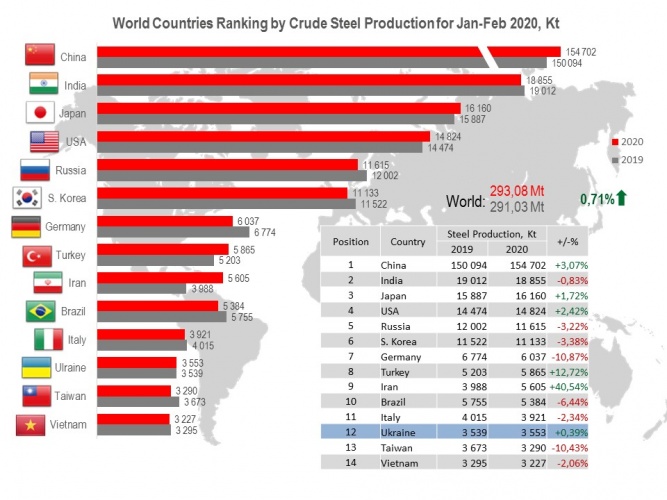 Among 64 world steelmaking countries, Ukraine occupies the 12th position (3.55 Mt or 100.4% to Jan-Feb 2019).