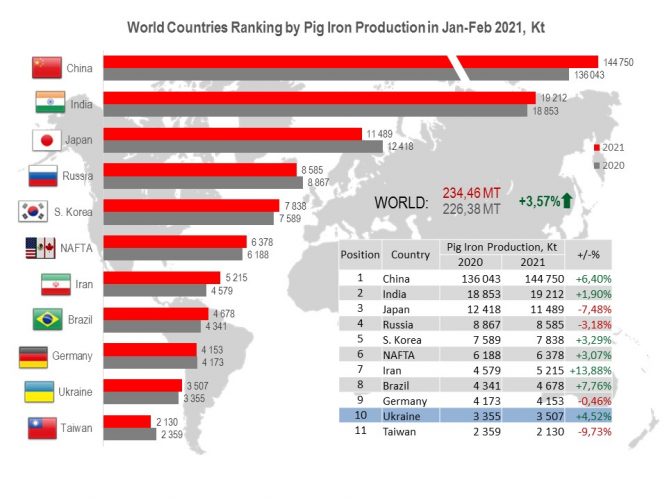 Ukraine (3.51 Mt or 104.5% to Jan-Feb 2021) occupies the 10th position among 38 pig iron producers.