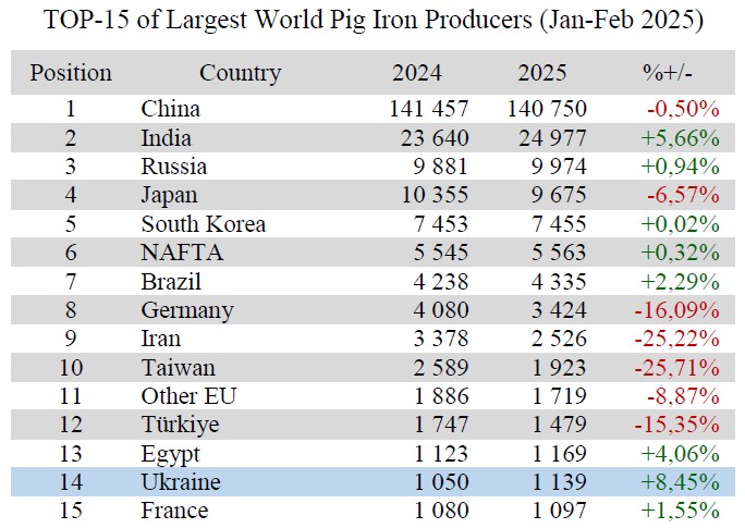 Ukraine (1.14 Mt or 108.45% to Jan-Feb 2024) remains on 14th position among 40 world pig iron producers.