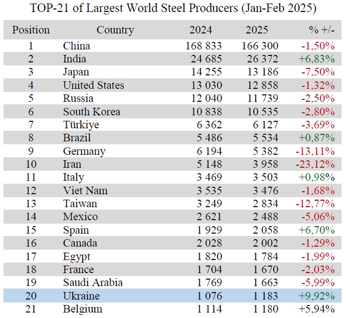 Ukraine in the World Ferrous Production in Jan-Feb 2025