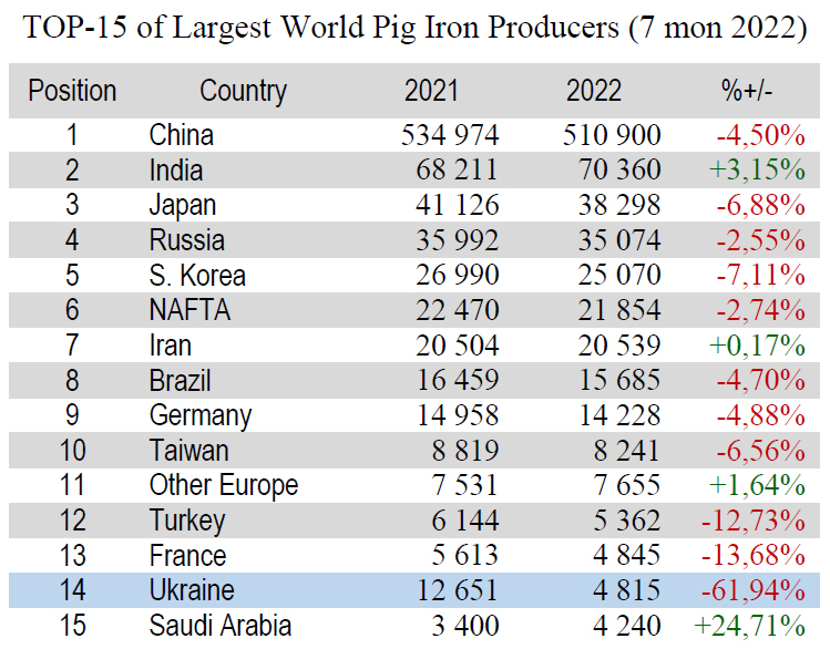 Ukraine (4.82 Mt or 38.06% to Jan-July 2021) occupies the 14th position among 40 world pig iron producers.