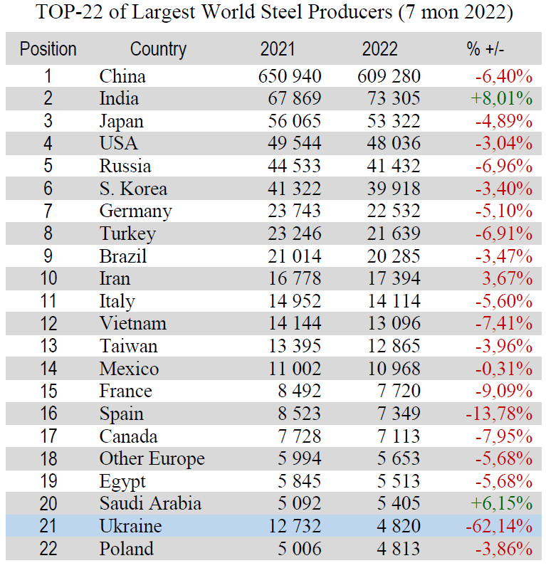 Ukraine (4.82 Mt or 37.86% to Jan-July 2021) occupies 21th position among 64 world steel producers.