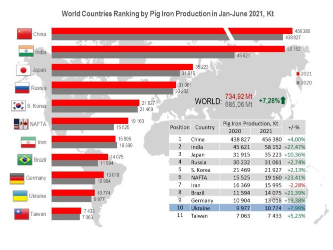 Ukraine (10.77 Mt or 108.0% to Jan-June 2020) occupies the 10th position among 38 pig iron producers.