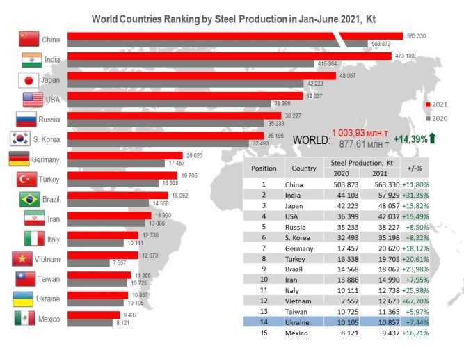 Ukraine (10.86 Mt or 107.4% to Jan-June 2020) occupies 14th position among 64 world steel producers.