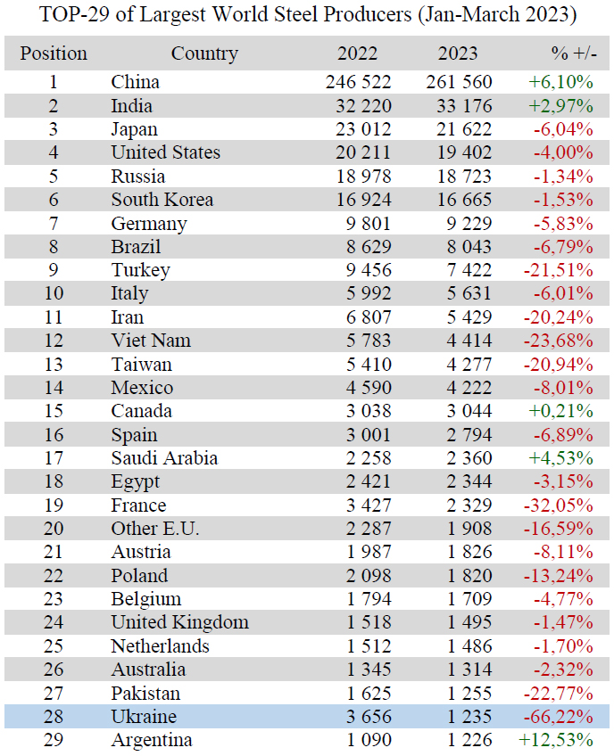 Ukraine (1.24 Mt or 33.78% to Jan-March 2022) raised from 31th to 28th position among 64 world steel producers.