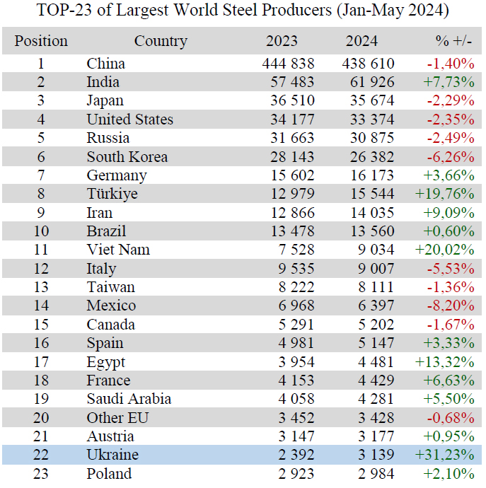 Ukraine (3.14 Mt or 131.23% to Jan-May 2023) remains on 22nd position among 71 world steel producers.
