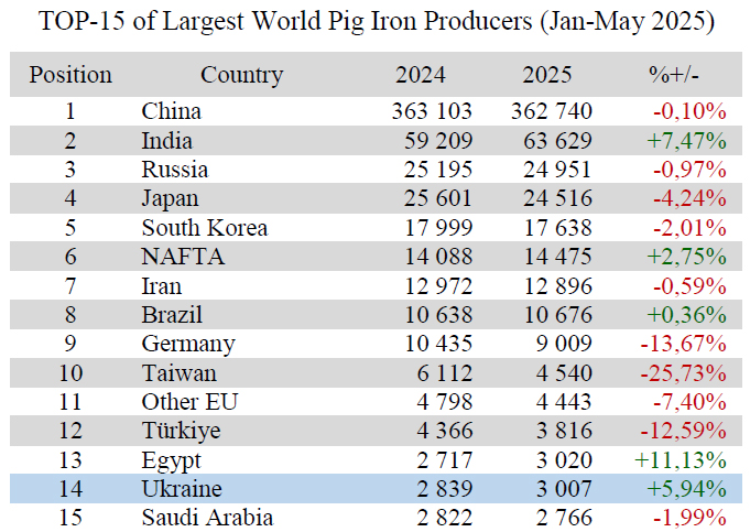 Ukraine (3.01 Mt or 105.94% to Jan-May 2024) remains on 14th position among 40 world pig iron producers.