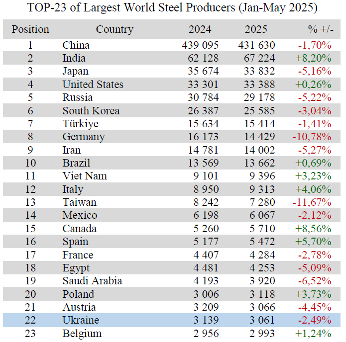 Ukraine (3.06 or 97.51% to Jan-May 2024) shifted down from 21st to 22nd position among 71 world steel producers.