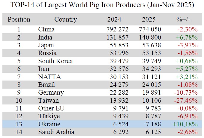 Ukraine (7.19 Mt or 110.18% to Jan-Nov 2024) remains on 13th position among 40 world pig iron producers.