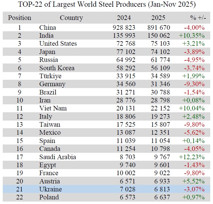 Ukraine (6.81 MT or 96.93% to Jan-Nov 2024) raised from 22nd to 21st position among 71 world steel producers.