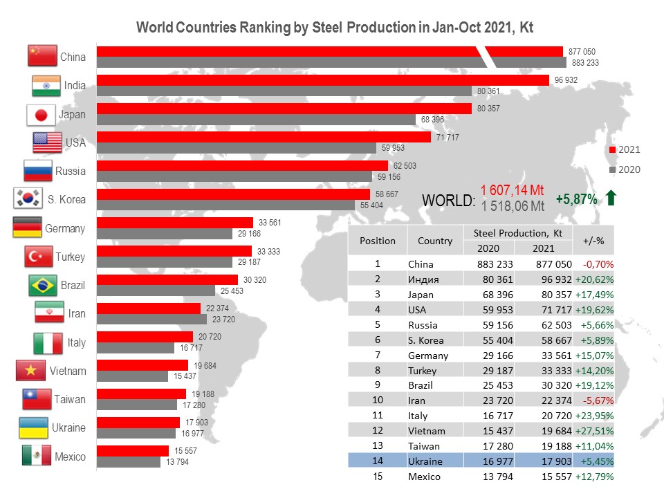 Ukraine (17.90 Mt or 105.5% to Jan-Oct 2020) occupies 14th position among 64 world steel producers.
