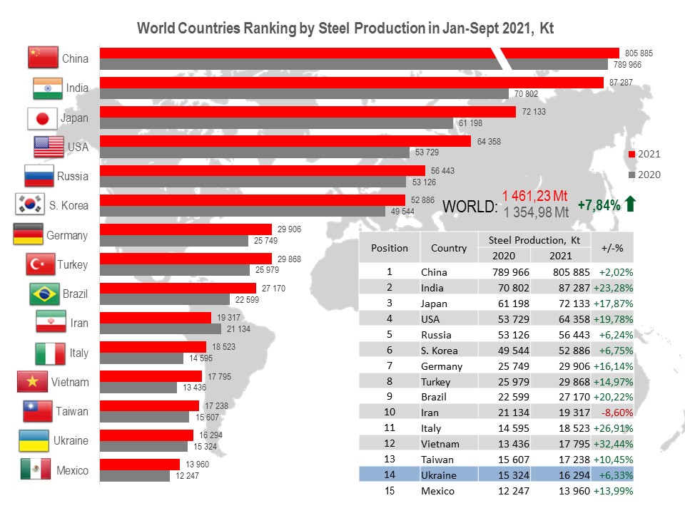 Ukraine (16.29 Mt or 106.3% to Jan-Sept 2020) occupies 14th position among 64 world steel producers.