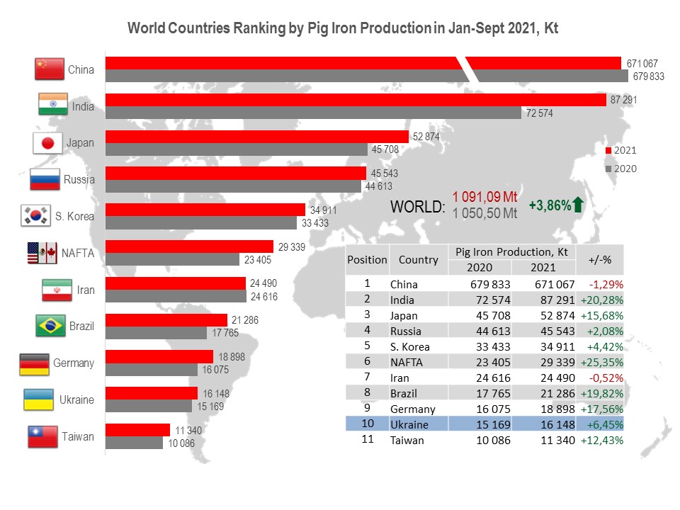 Ukraine (16.15 Mt or 106.5% to Jan-Sept 2020) occupies the 10th position among 38 world pig iron producers.