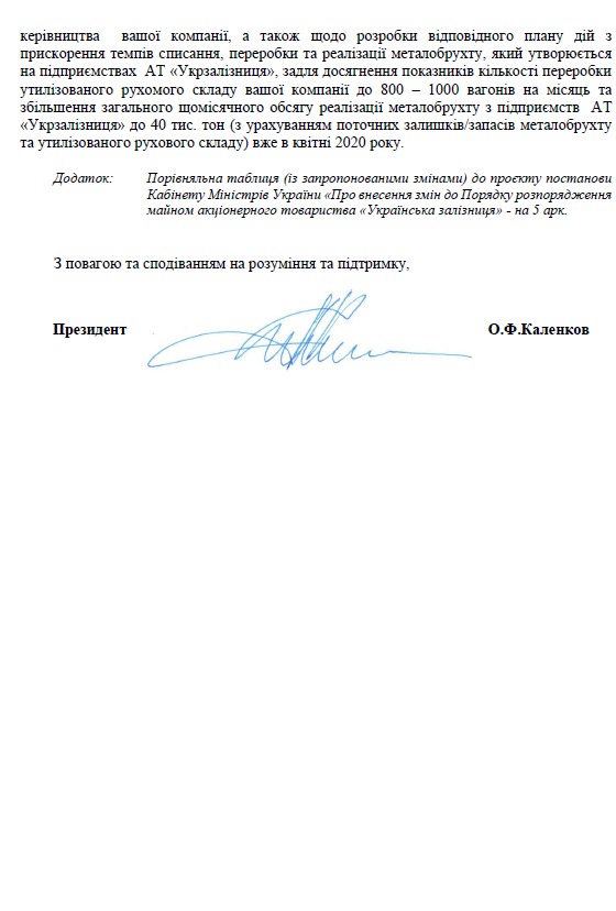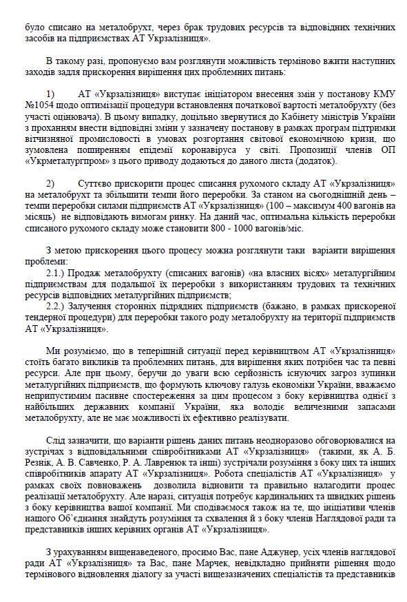 З урахуванням вищенаведеного, просимо Вас, пане Аджунер, усіх членів наглядової ради АТ «Укрзалізниця» та Вас, пане Марчек, невідкладно прийняти рішення щодо термінового відновлення діалогу за участі вищезазначених спеціалістів та представників керівництва вашої компанії, а також щодо розробки відповідного плану дій з прискорення темпів списання, переробки та реалізації металобрухту, який утворюється на підприємствах АТ «Укрзалізниця», задля досягнення показників кількості переробки утилізованого рухомого складу вашої компанії до 800 – 1000 вагонів на місяць та збільшення загального щомісячного обсягу реалізації металобрухту з підприємств АТ «Укрзалізниця» до 40 тис. тон (з урахуванням поточних залишків/запасів металобрухту та утилізованого рухового складу) вже в квітні 2020 року.»