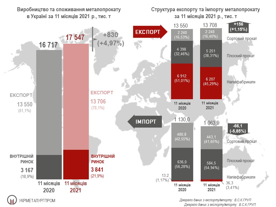 За даними ОП «Укрметалургпром», у січні-листопаді 2021 р. українськими металургійними підприємствами вироблено 17,55 млн т металопрокату (105,0% відносно аналогічного періоду 2020 р.), з яких, за інформацією В.С.К.ГРУП, експортовано порядку 13,71 млн т, або 78,1%. В аналогічному періоді 2020 р. частка експорту становила близько 81,1% (13,55 млн т при загальному виробництві металопрокату 16,72 млн т).