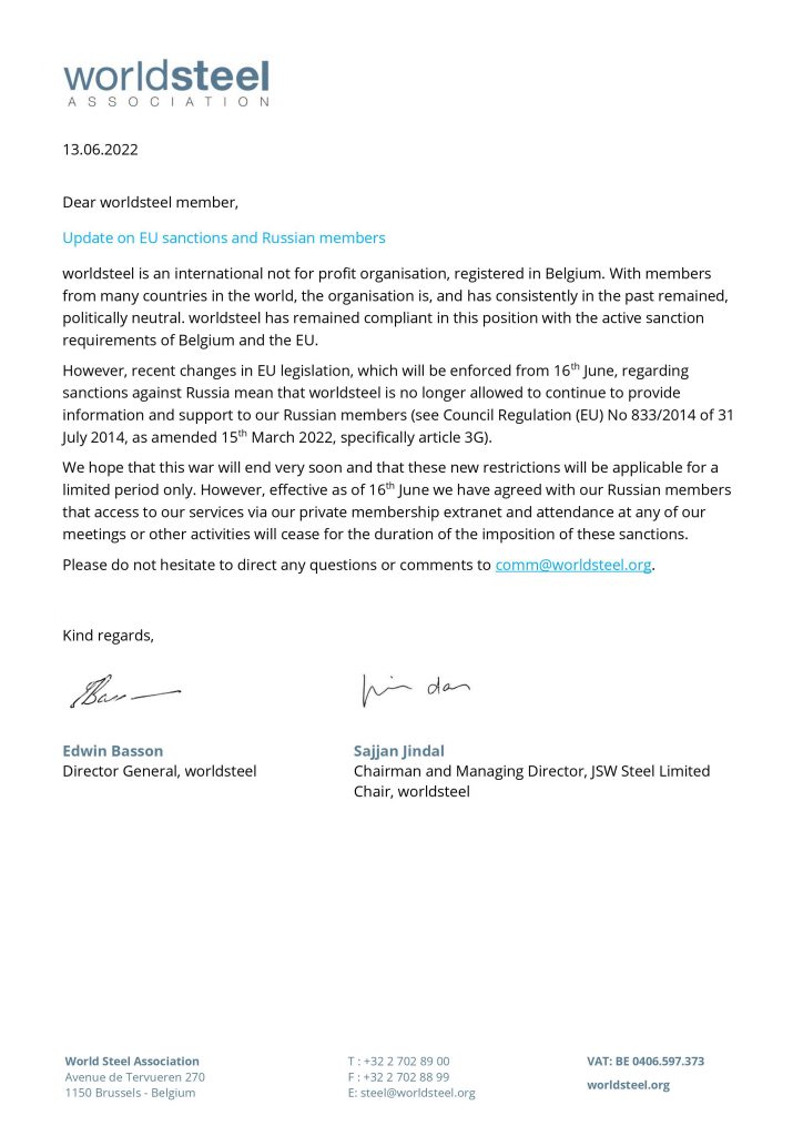 Незважаючи на те, що Worldsteel не є політичною організацію і має у своїм складі представників всіх без виключення металургійних країн світу, нещодавні зміни у законодавстві Європейського союзу стосовно санкцій проти росії внаслідок військової агресії останньої в Україні, які набувають чинності з 16 червня 2022 р., не дозволяють продовжувати будь-які стосунки з російською стороною в плані обміну інформацією та участі у спільних заходах.